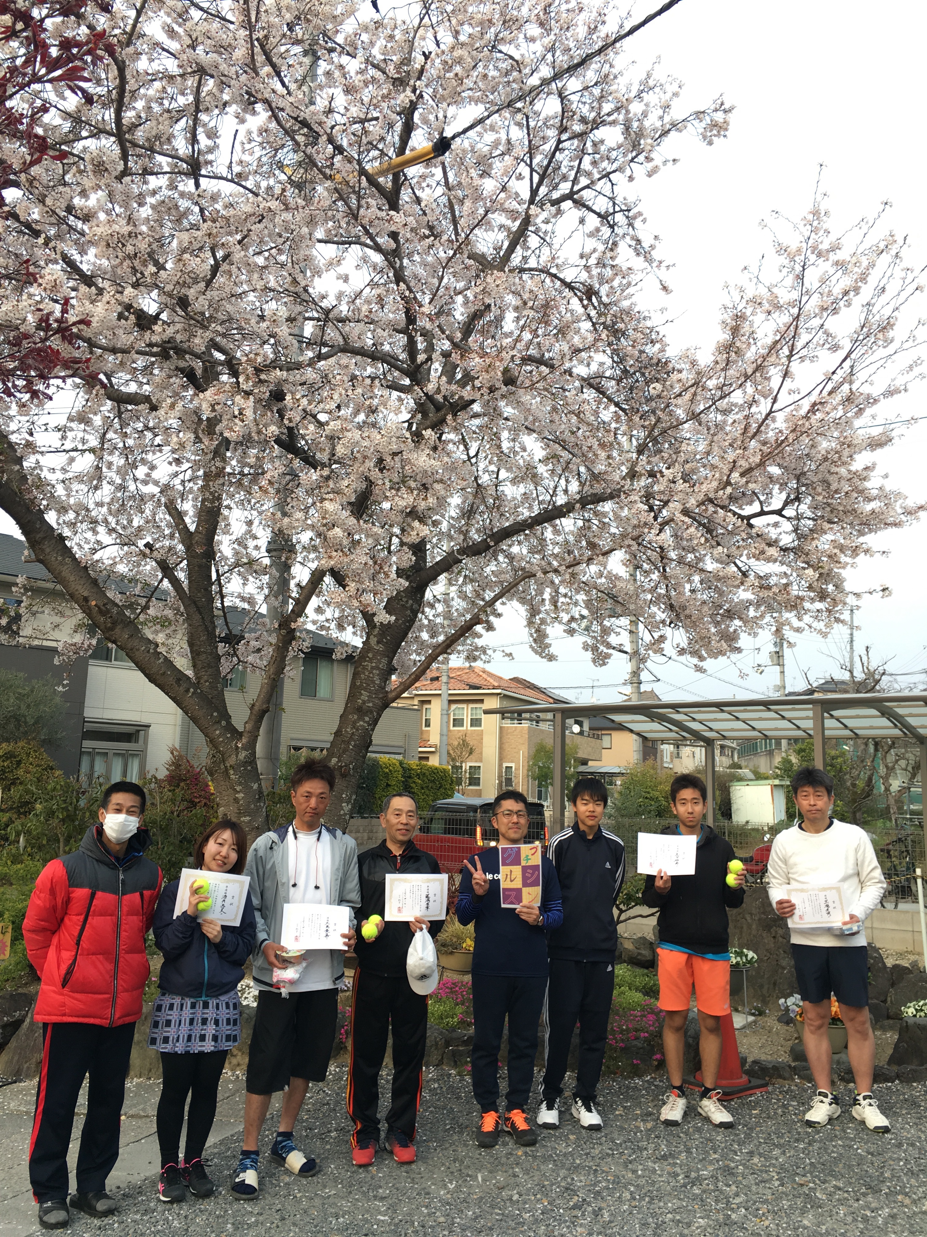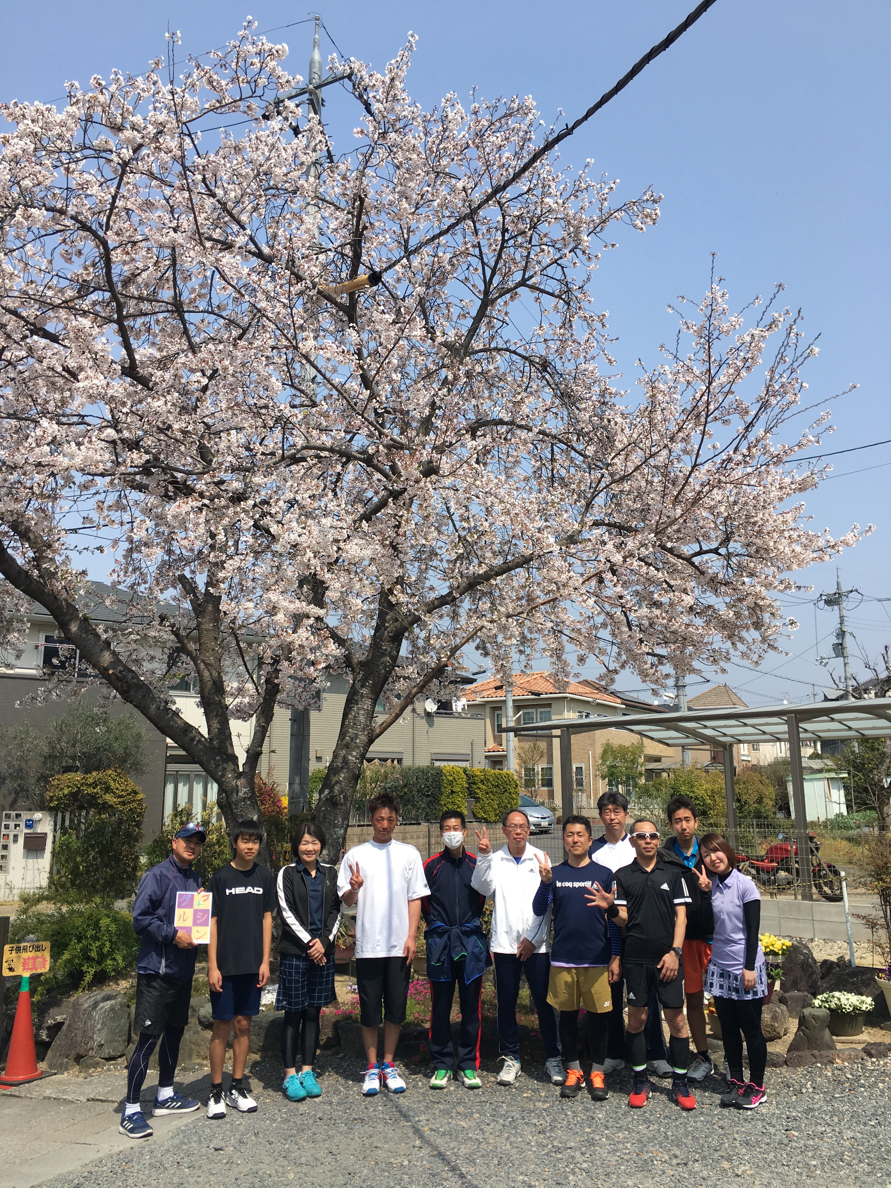 京都大会で使っているコートのクラブハウスのところに、大きな桜があるのですが、今年は、大会の日に満開になっておりましたので、試合前に記念写真を撮らせていただきました!