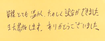この点、負けたら帰る方式の試合だと、特に試合経験が少なく、そんなに強くない方は、割りを食ってしまって、自分の課題も明確にならず、試合勘もつかないまま帰ることになってしまいますので、おっしゃる通り、また機会がございましたら、お気軽にお越しいただけたらと思います!