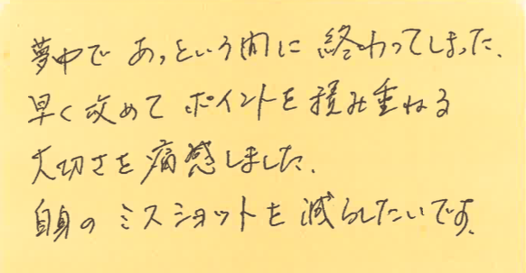それと、練習と試合の差を痛感されたとのことですが、これは、本当に多くの方が感じることで、全然違うんですよね!