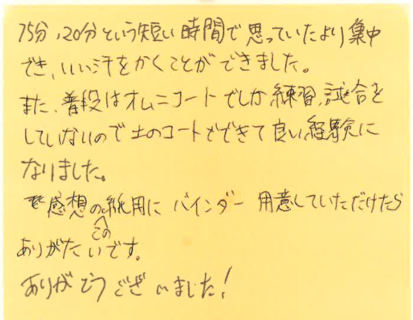 ぜひこの経験を活かして、これからのテニスをお楽しみください!