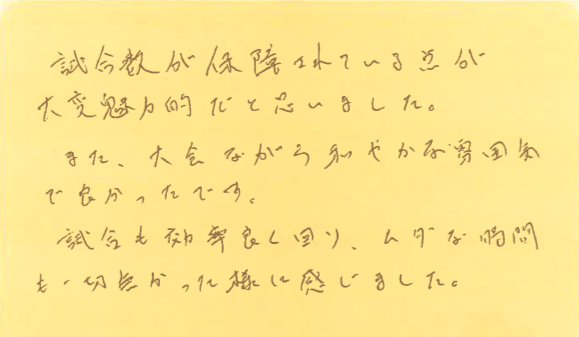 「試合数の保証、効率良く回り、無駄な時間のカット」という当大会の特徴を最大限にご理解頂き、さらに楽しんで頂けて、大変嬉しく思います!