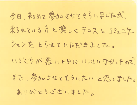 ・・・テニスの大会に限らず、多くの場合、初参加の時は、誰も知り合いがいないので、居心地が悪いと感じることが多いのですが、私はそういうのが嫌なので、そうならないように大会を運営させていただいておりますので、その面も含めてお楽しみいただけたようで嬉しいです!