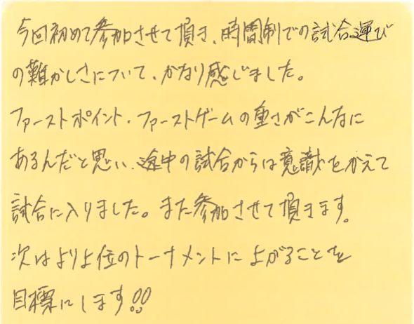 今回は、9月23日の大阪(北村)大会(LAWNカップ!)に初めて参加された方の感想と私からのお返事をシェアさせていただきます!