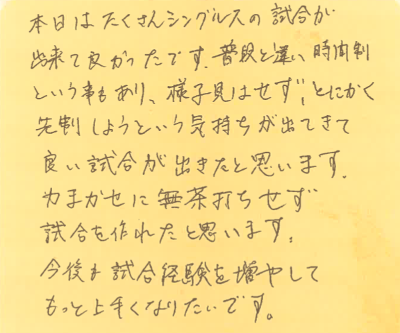 プチシングルス大会に出る前は、15分は短いと思っていても、実際にやってみると、案外長いし、充分な試合を楽しめるんですよね!