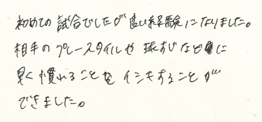 そして、良い経験になったとのこと、さらに、相手のプレースタイルや球すじなどに早く慣れることを意識することができたとのこと、素晴らしいです!!