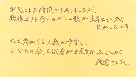 それと、「参加者の人数が少なく、レベルのあった試合ができなかった」とのことで、申し訳ありません!