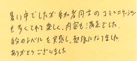 参加者同士の交流を楽しんで頂き、内容もご満足いただけたとのことで、うれしいです!色々な方と対戦することによって、気づきや学びを得られますね!ぜひまたご参加くださいませ!
