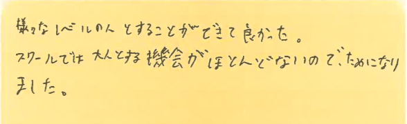 様々なレベルの人と試合を楽しんでもらえて、良かったです!また、大人の人と試合経験を積みに来てくださいね!