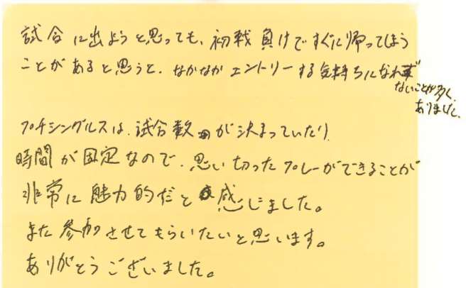負けても5試合保証されている、プチシングルス大会の良さをご理解頂き、うれしいです!