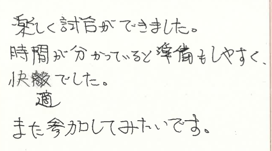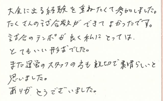 大会に出る経験を重ねる目的でご参加いただき、さらに試合の形式にもご満足頂けて、嬉しいです!