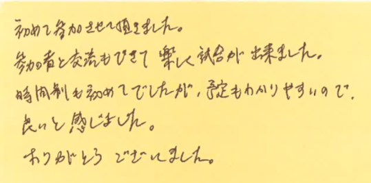 時間制の試合と参加者の皆さんとの交流を楽しんで頂き、良かったです!