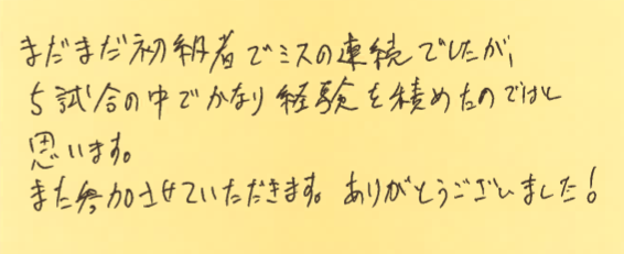 初めて参加された方が、大会を通して何を感じたのか?特に初めて参加しようとしている方の参考にしていただけたらと思います。