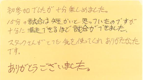 初めて参加された方が、大会を通して何を感じたのか?特に初めて参加しようとしている方の参考にしていただけたらと思います。
