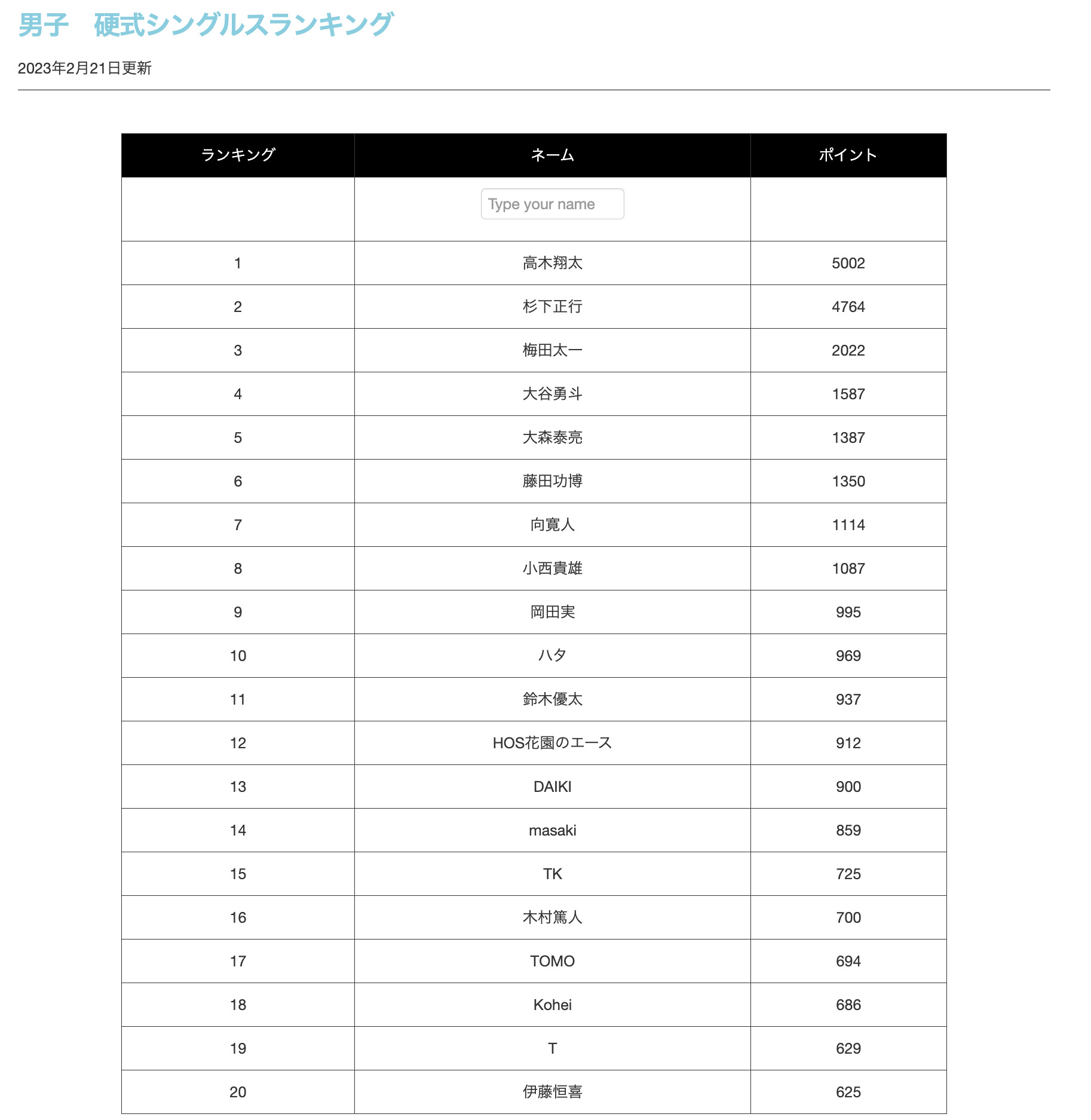 それで、2月21日の男子のトップ20がこちらになります!!