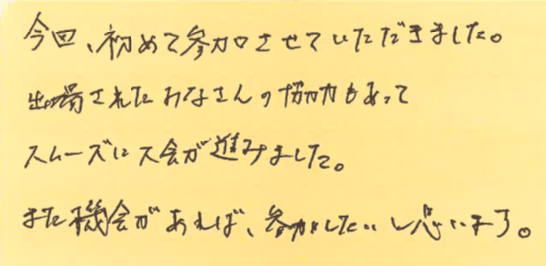 初めて参加された方が、大会を通して何を感じたのか?特に初めて参加しようとしている方の参考にしていただけたらと思います。