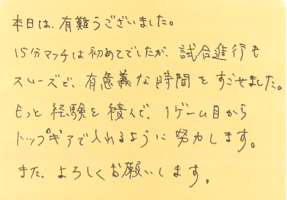 なお、この日は普段ダブルスをされている方が多く、ネットプレーが強い方が多かったため、とても苦戦させられました。