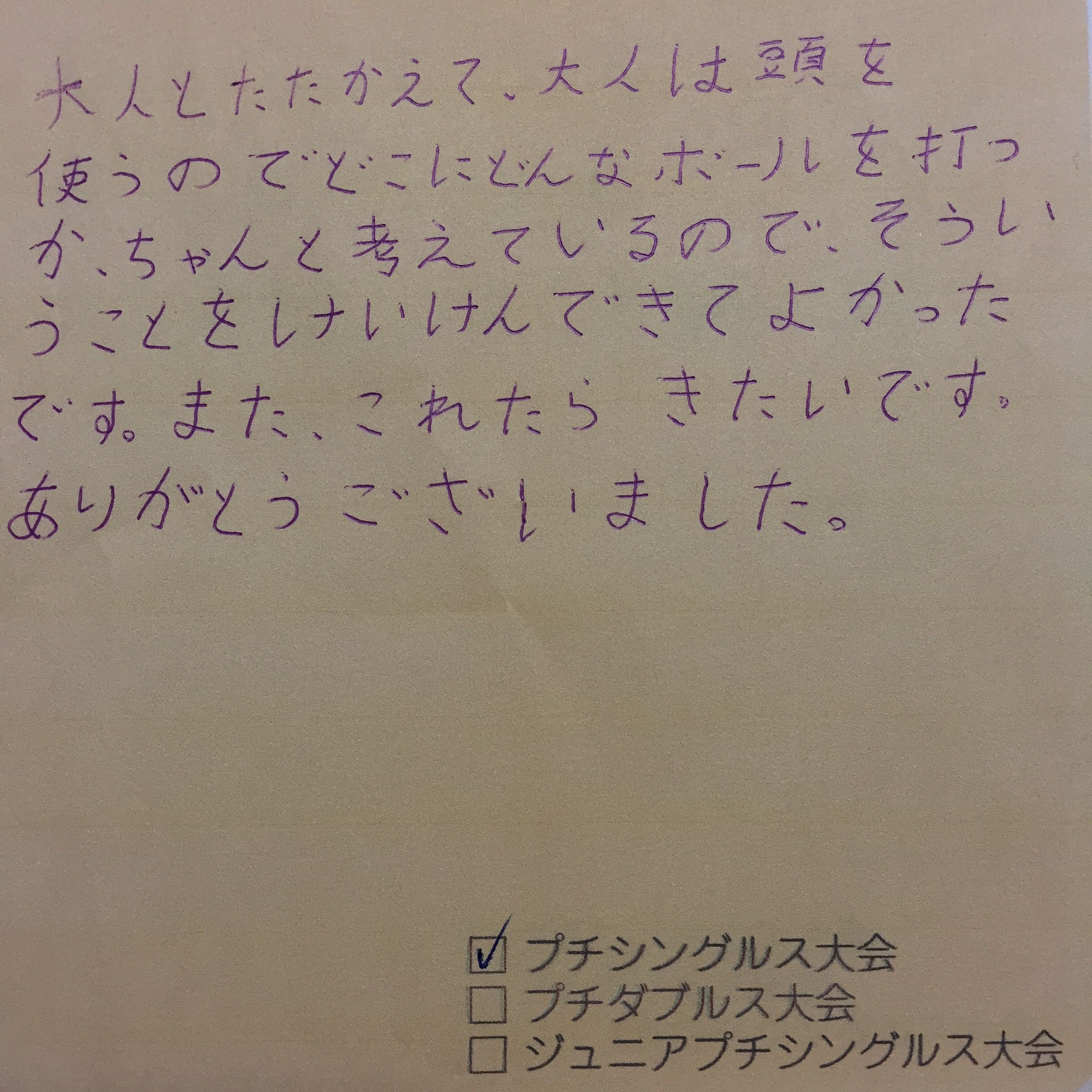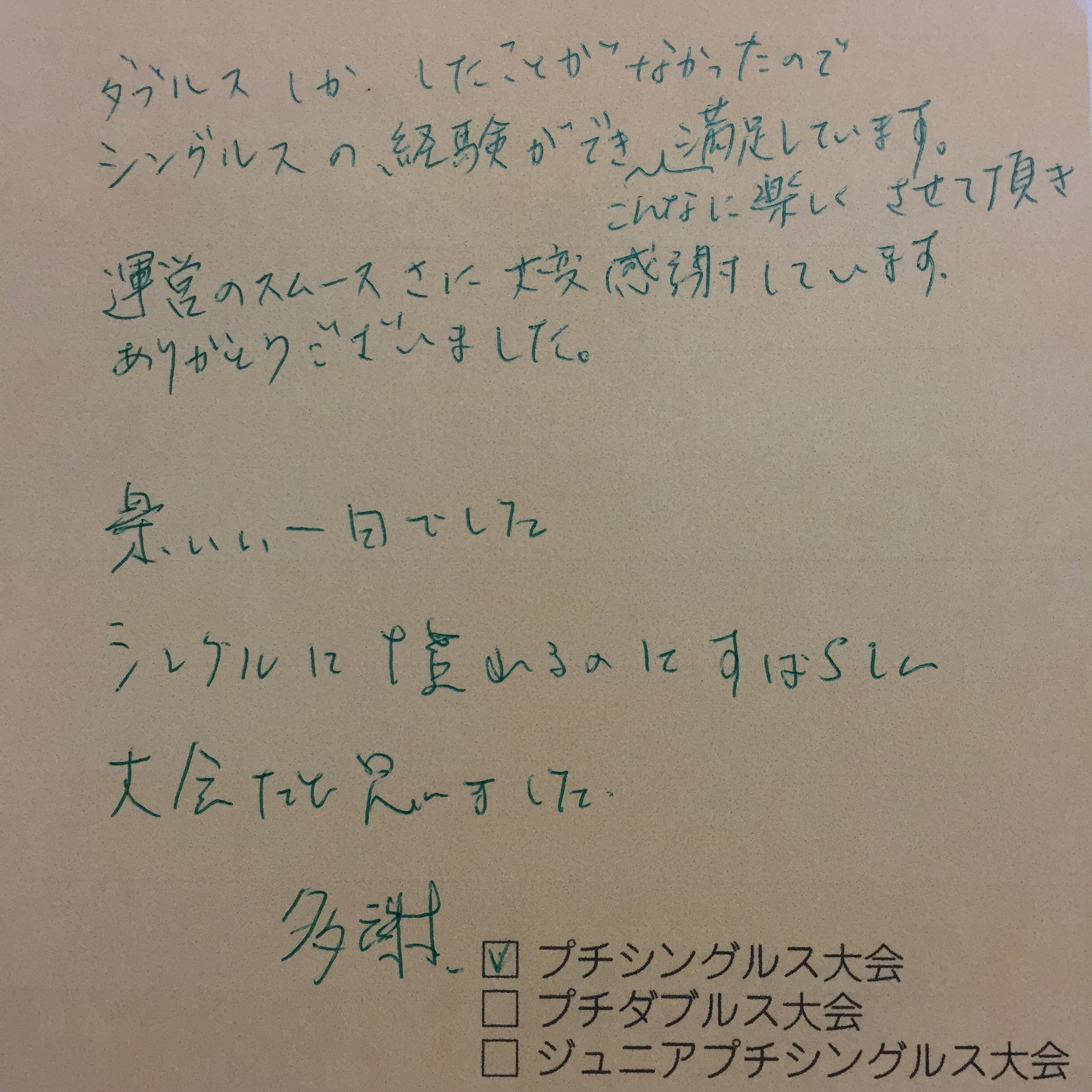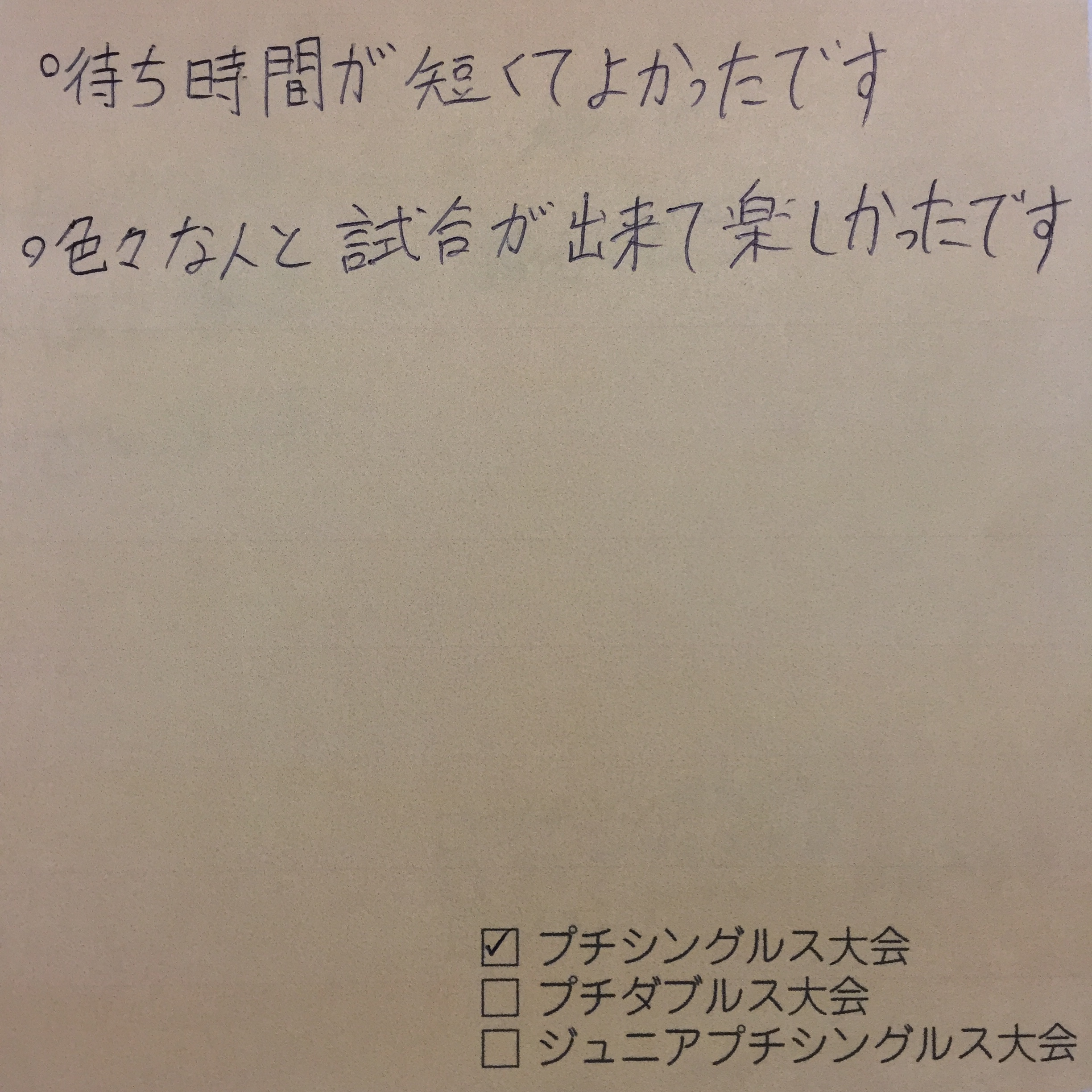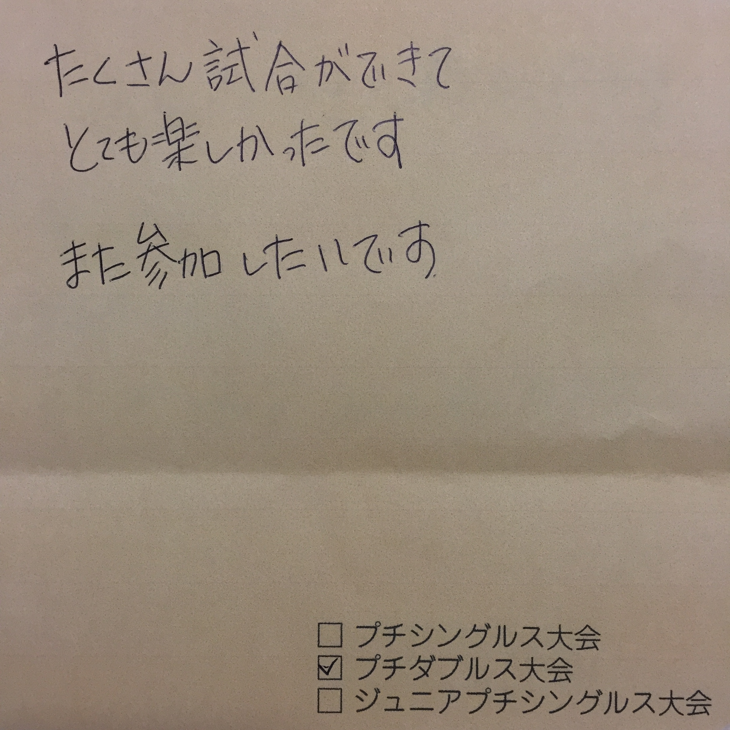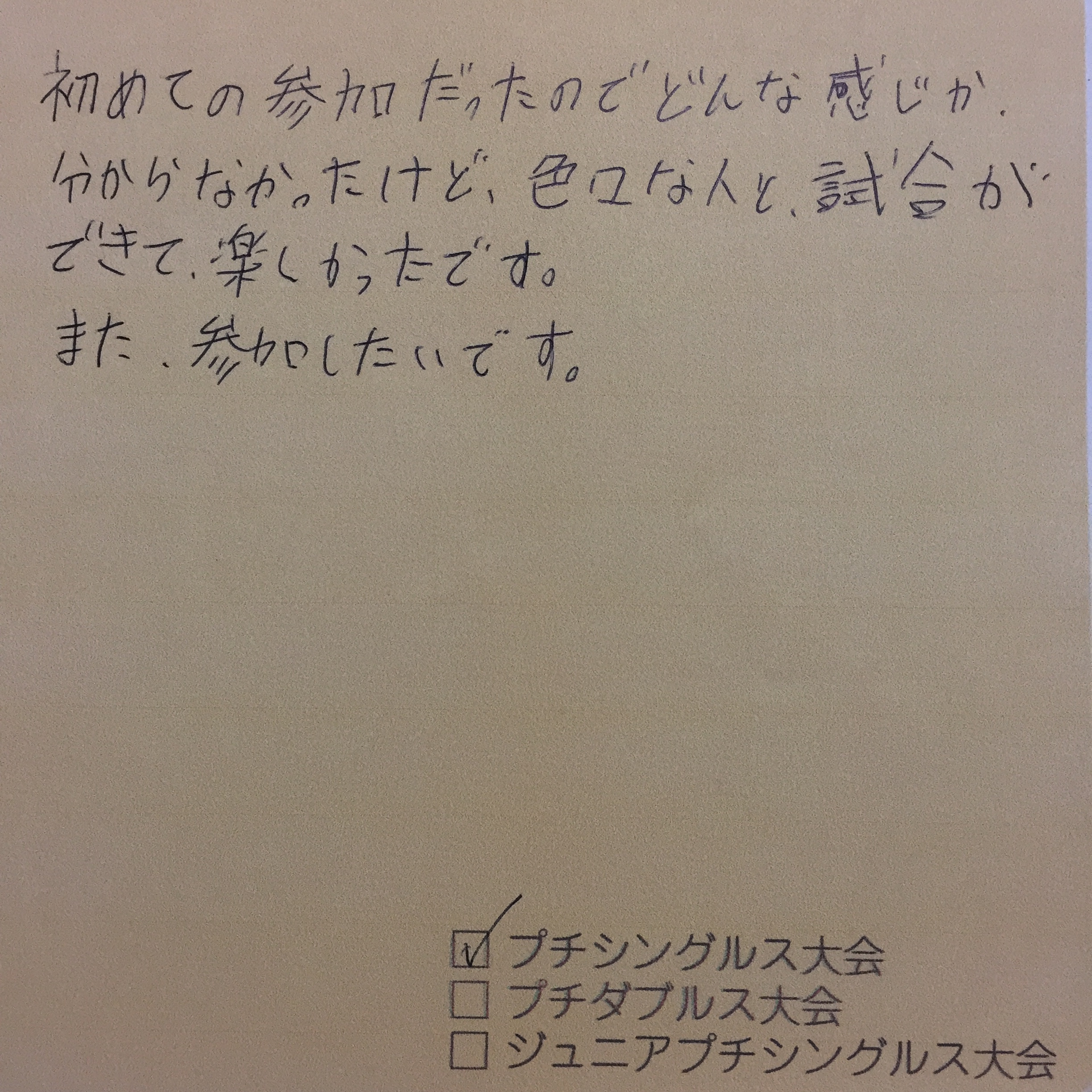 今回は、プチシングルス大会やプチダブルス大会に初めて参加してくださったみなさんの感想をアップさせていただきます!