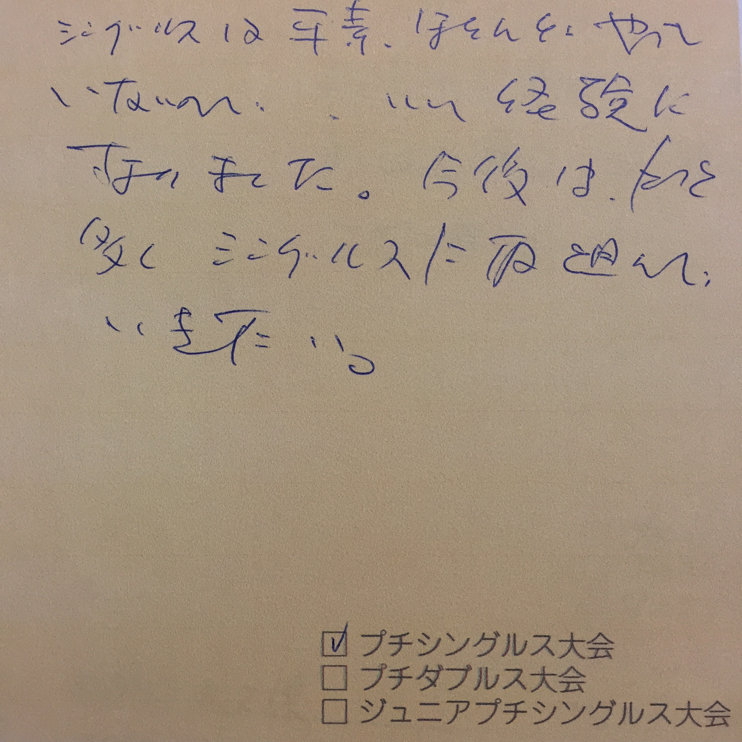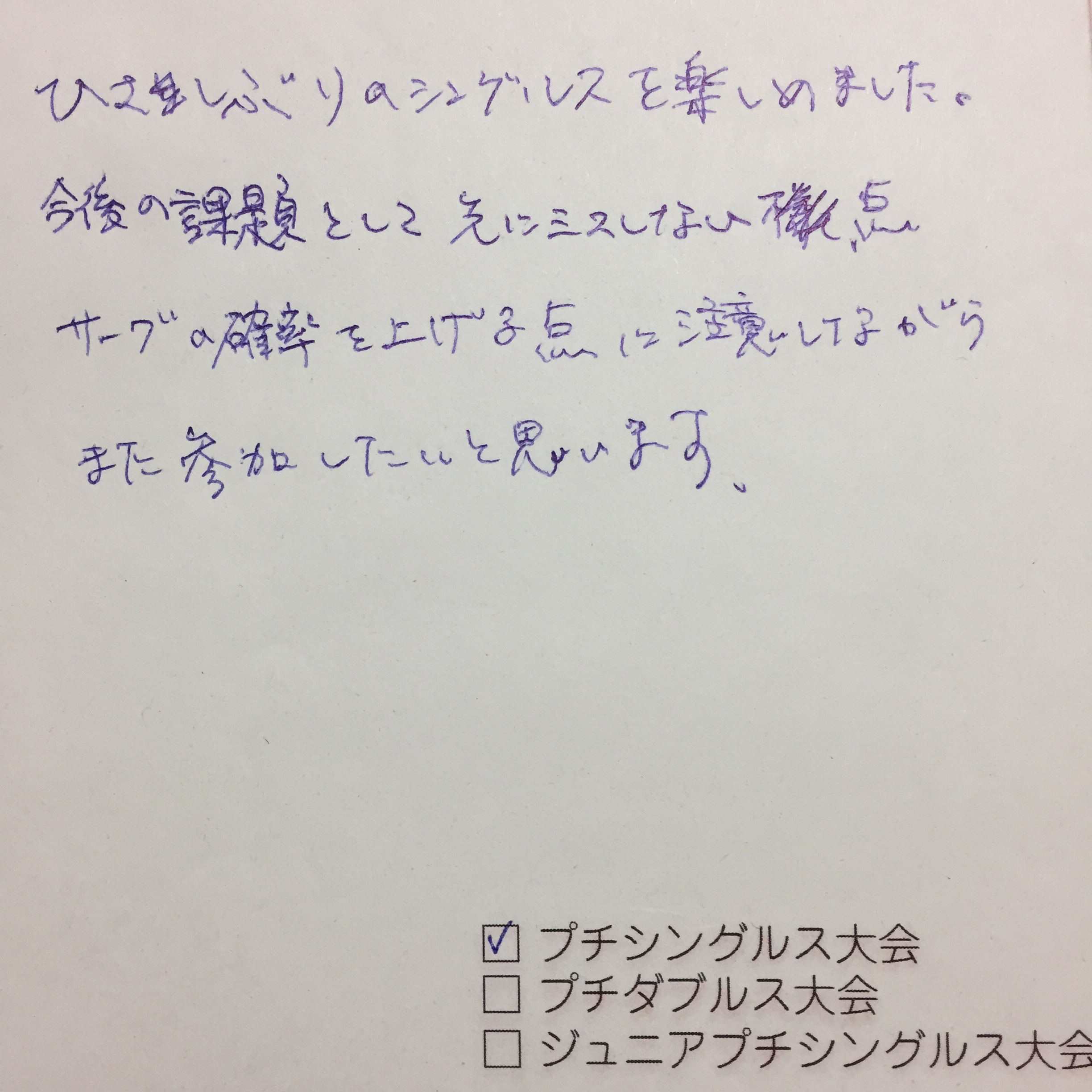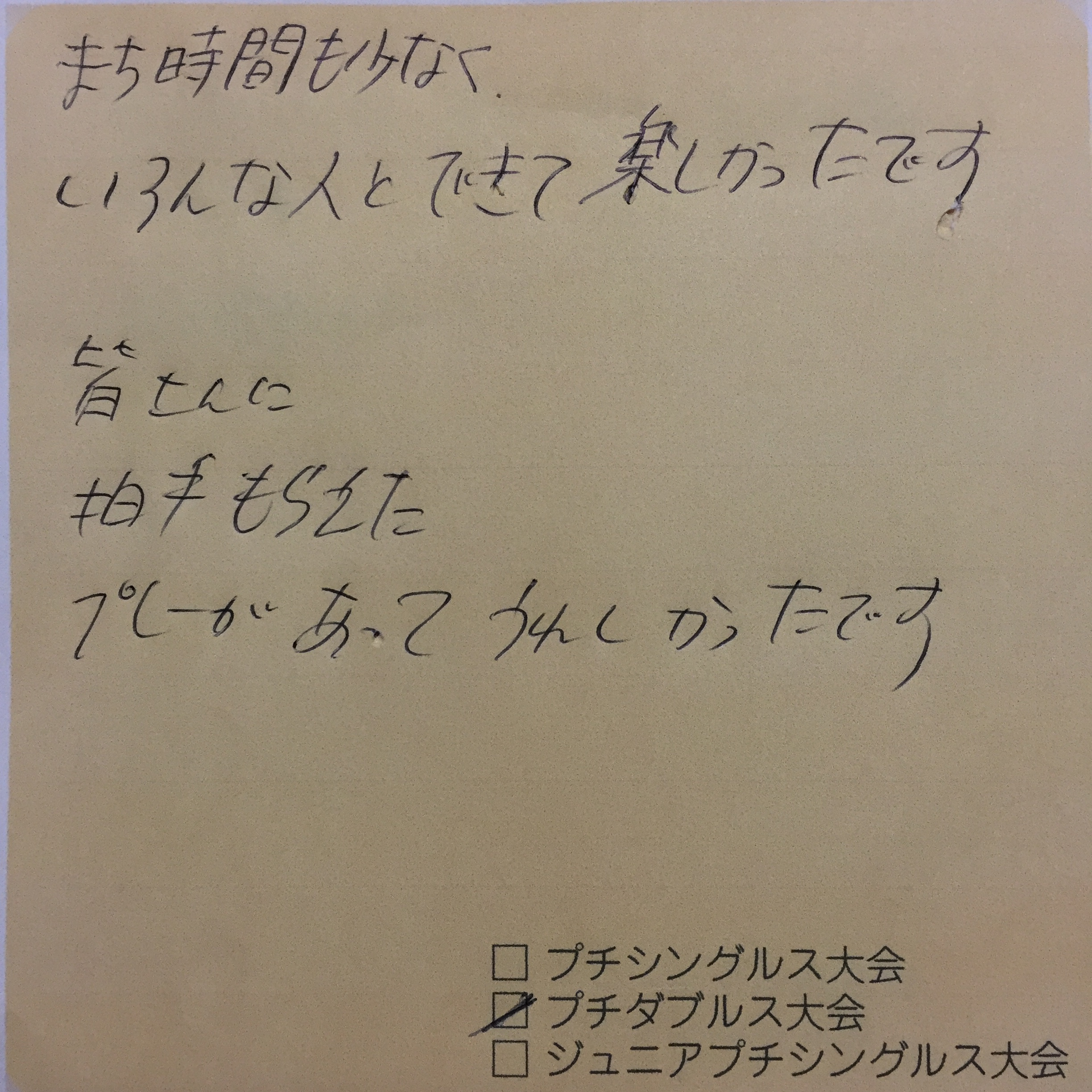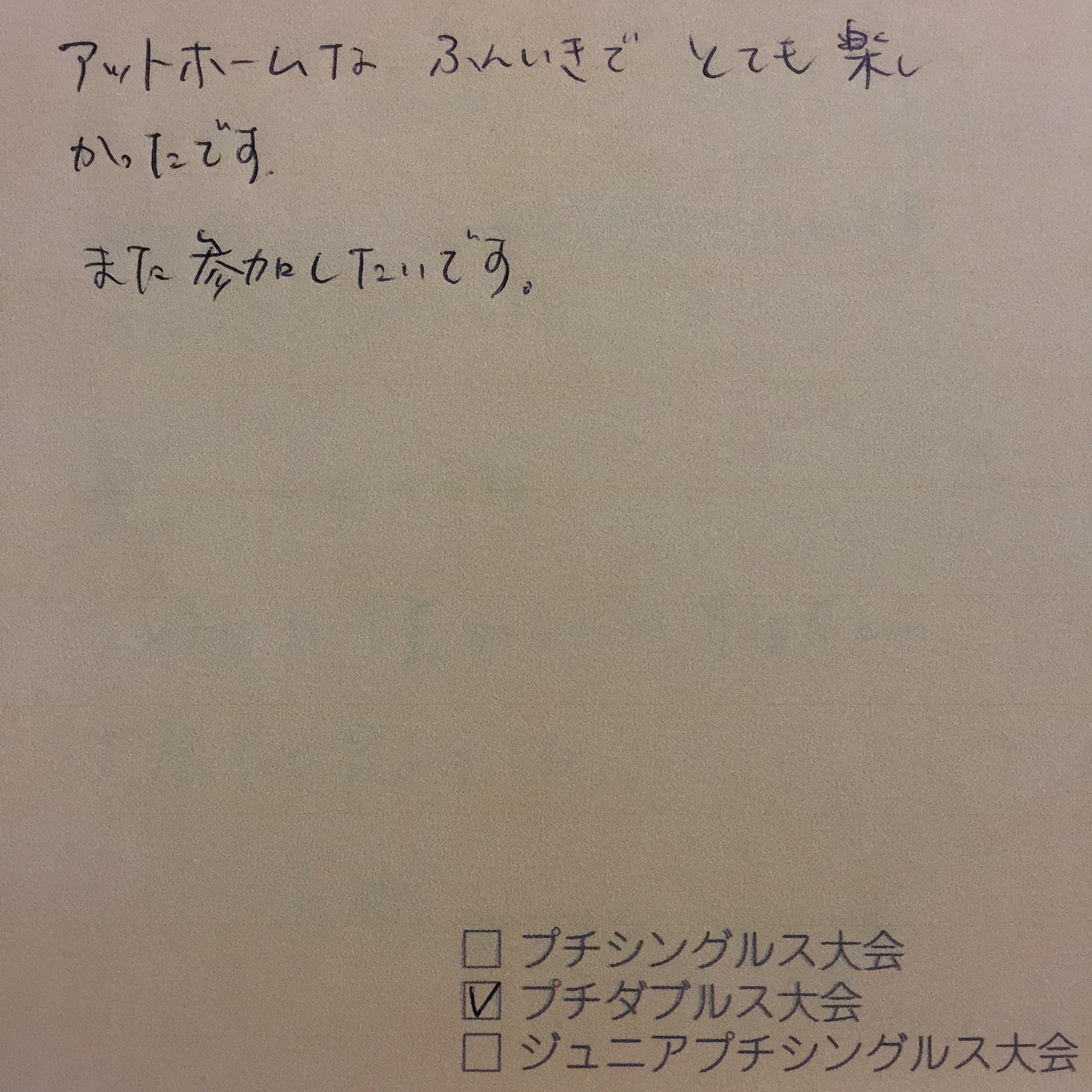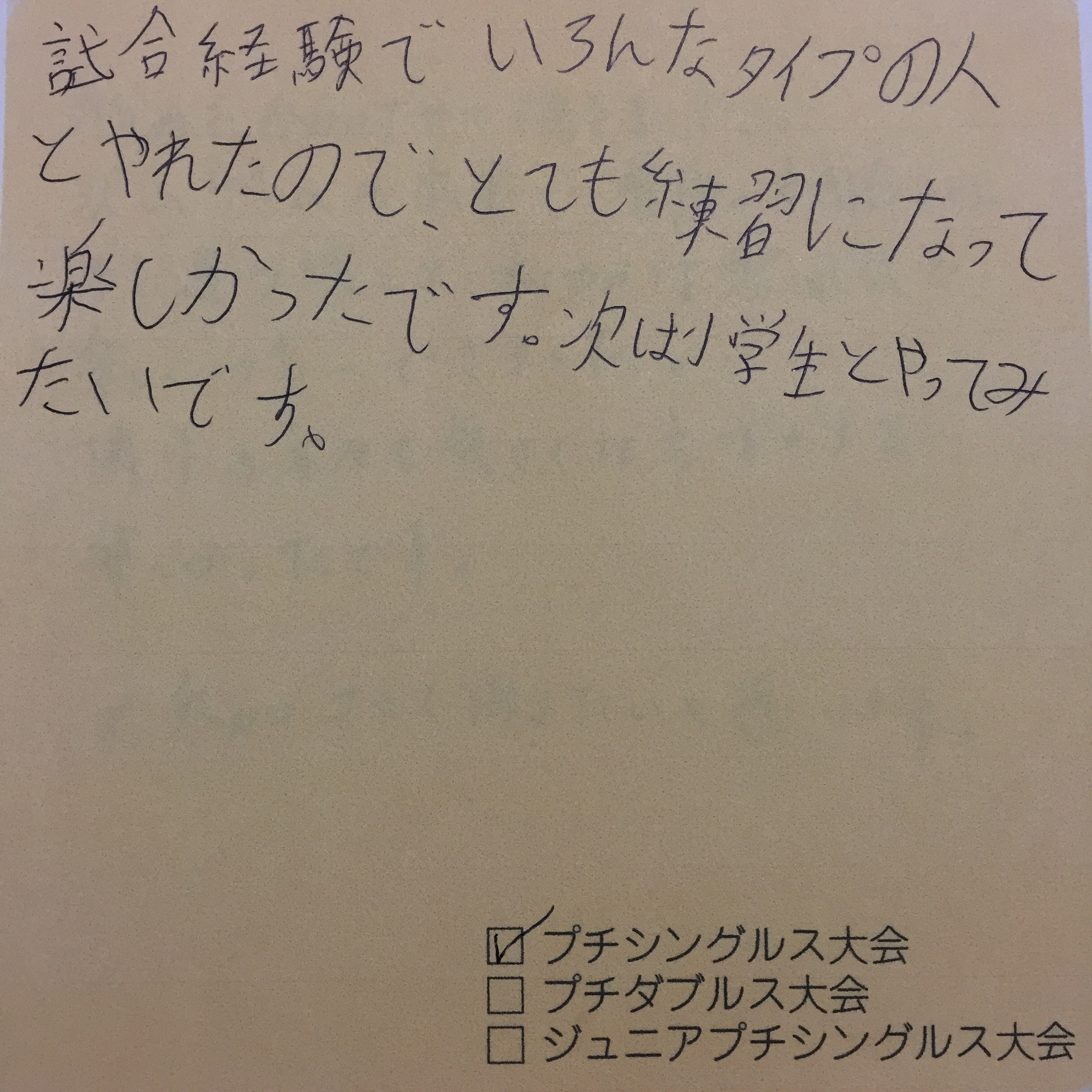 今回は、プチシングルス大会やプチダブルス大会に初めて参加してくださったみなさんの感想をアップさせていただきます!