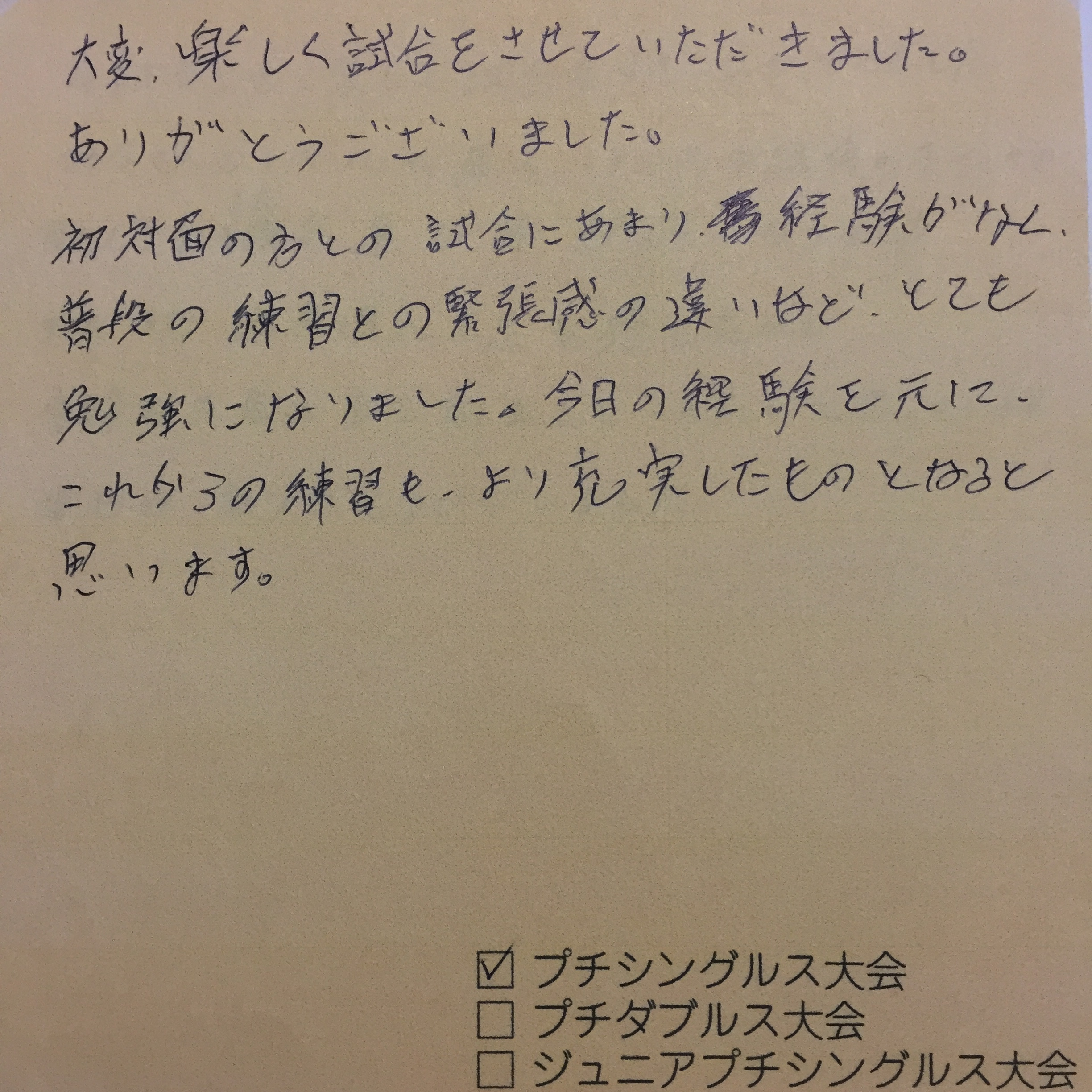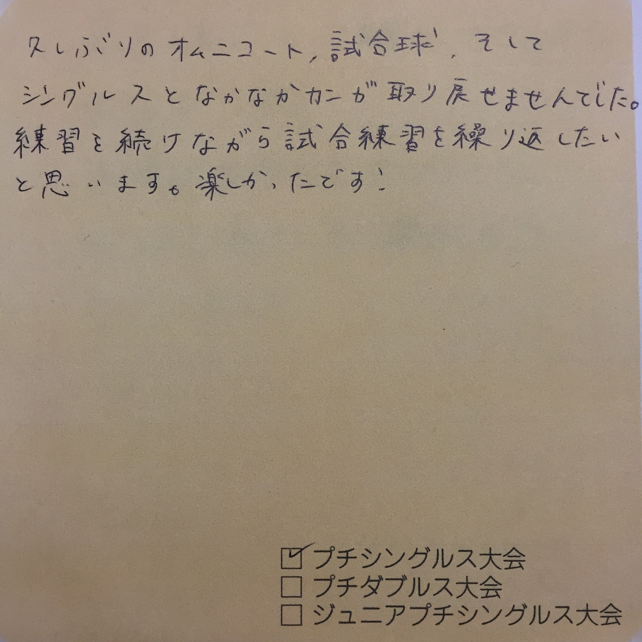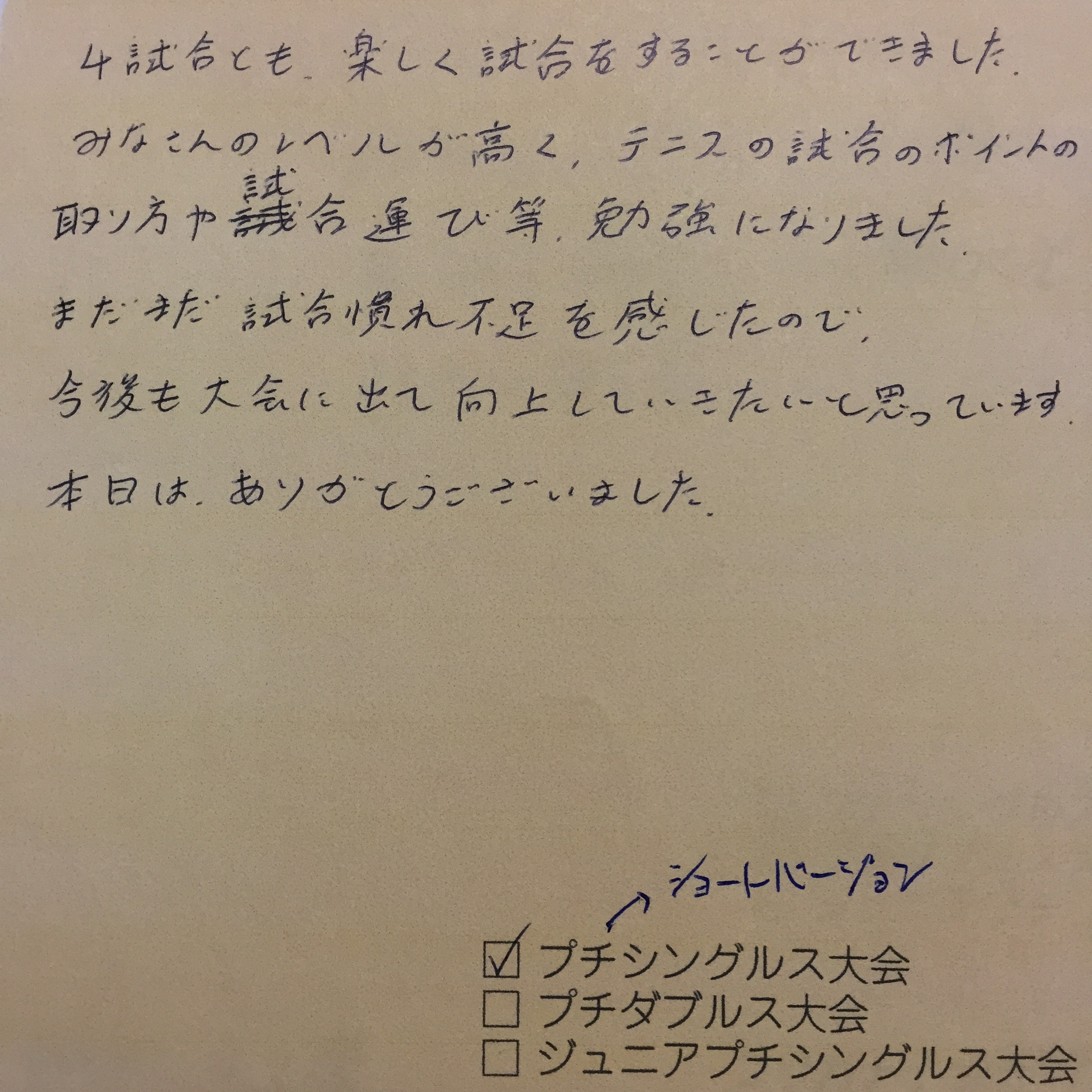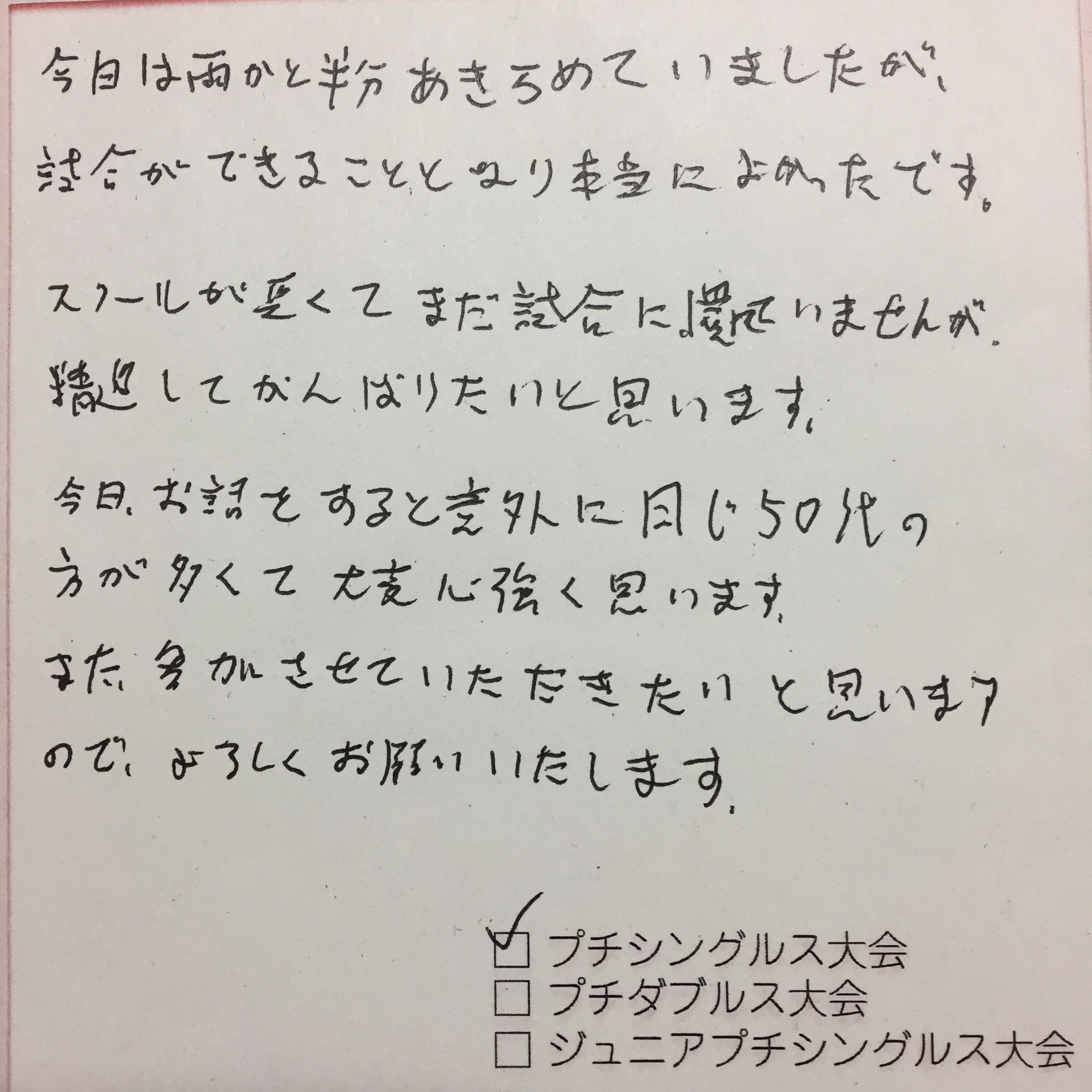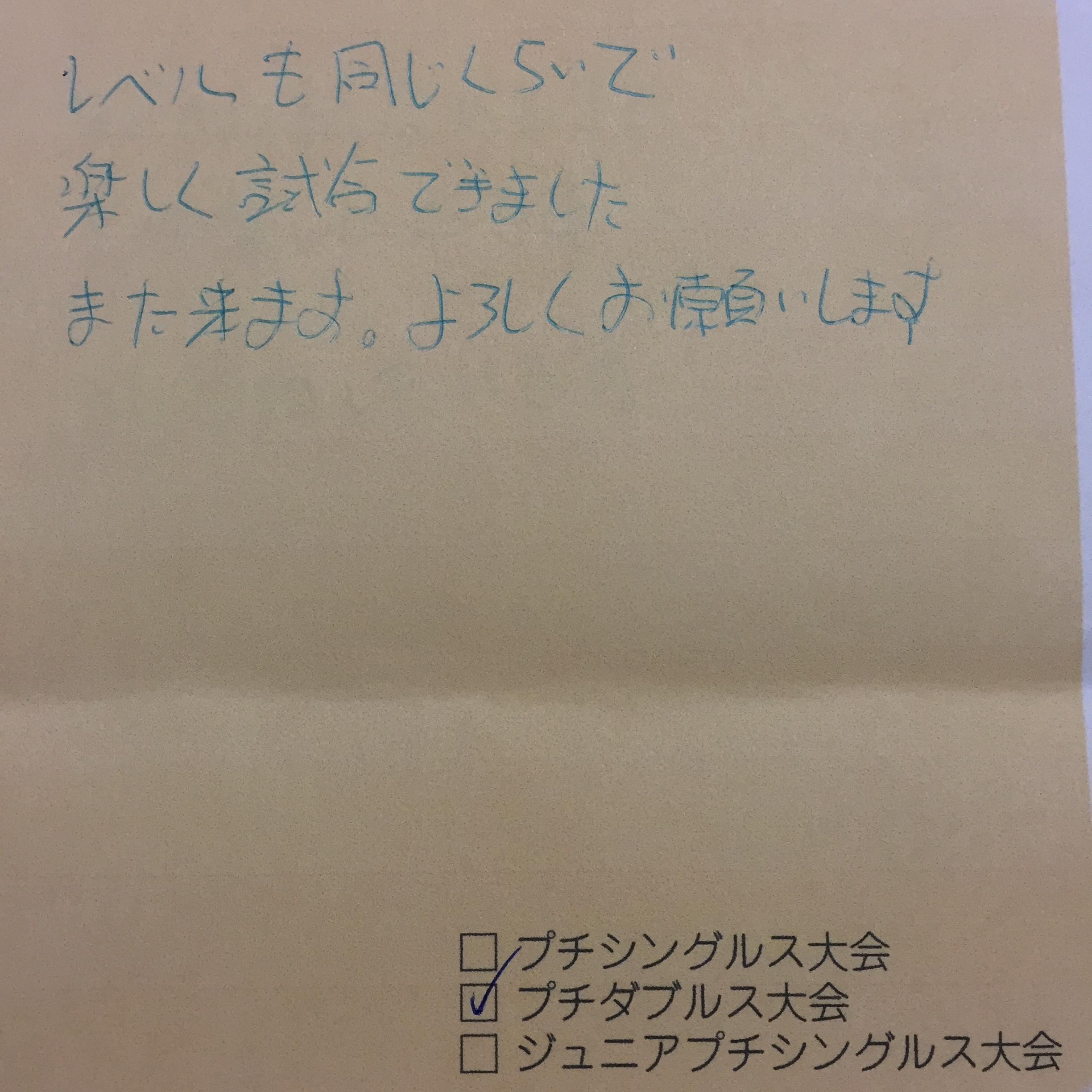 今回は、プチシングルス大会やプチダブルス大会に初めて参加してくださったみなさんの感想をアップさせていただきます!