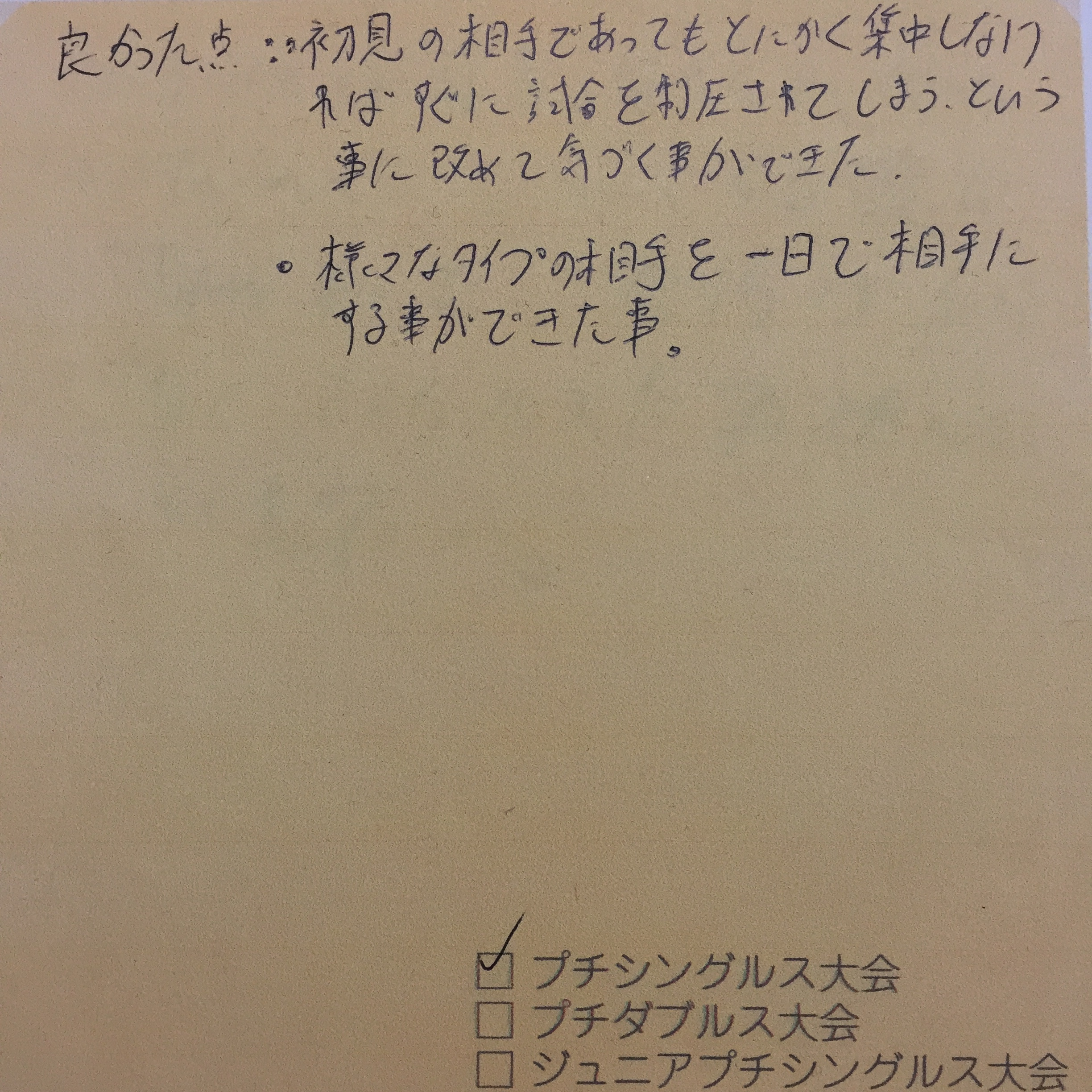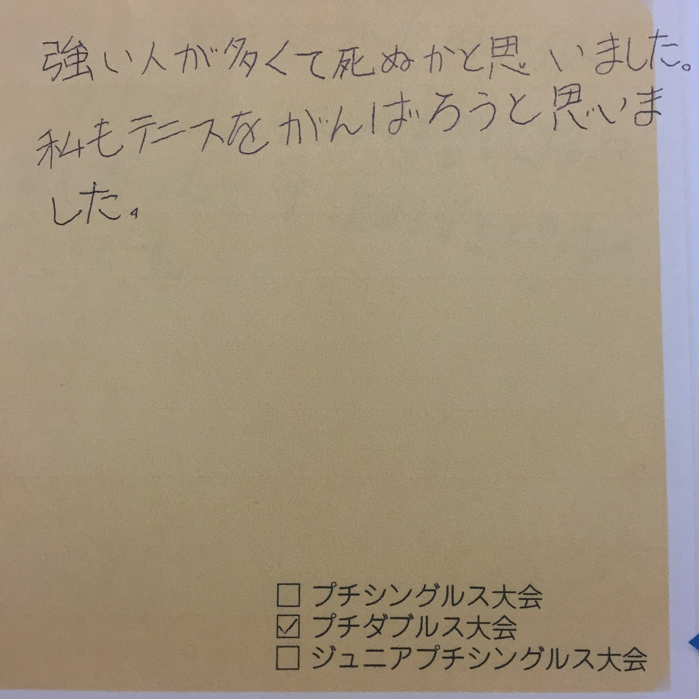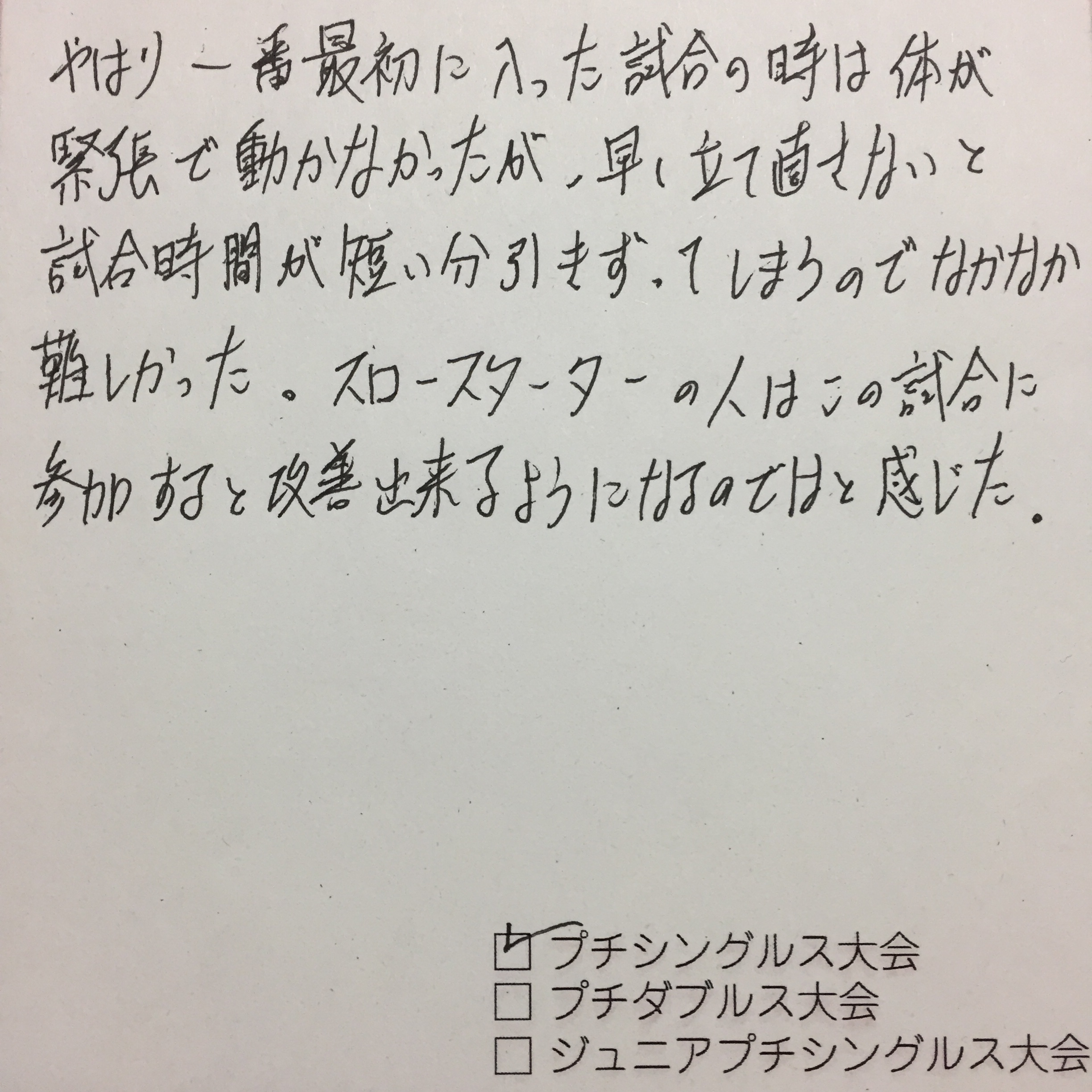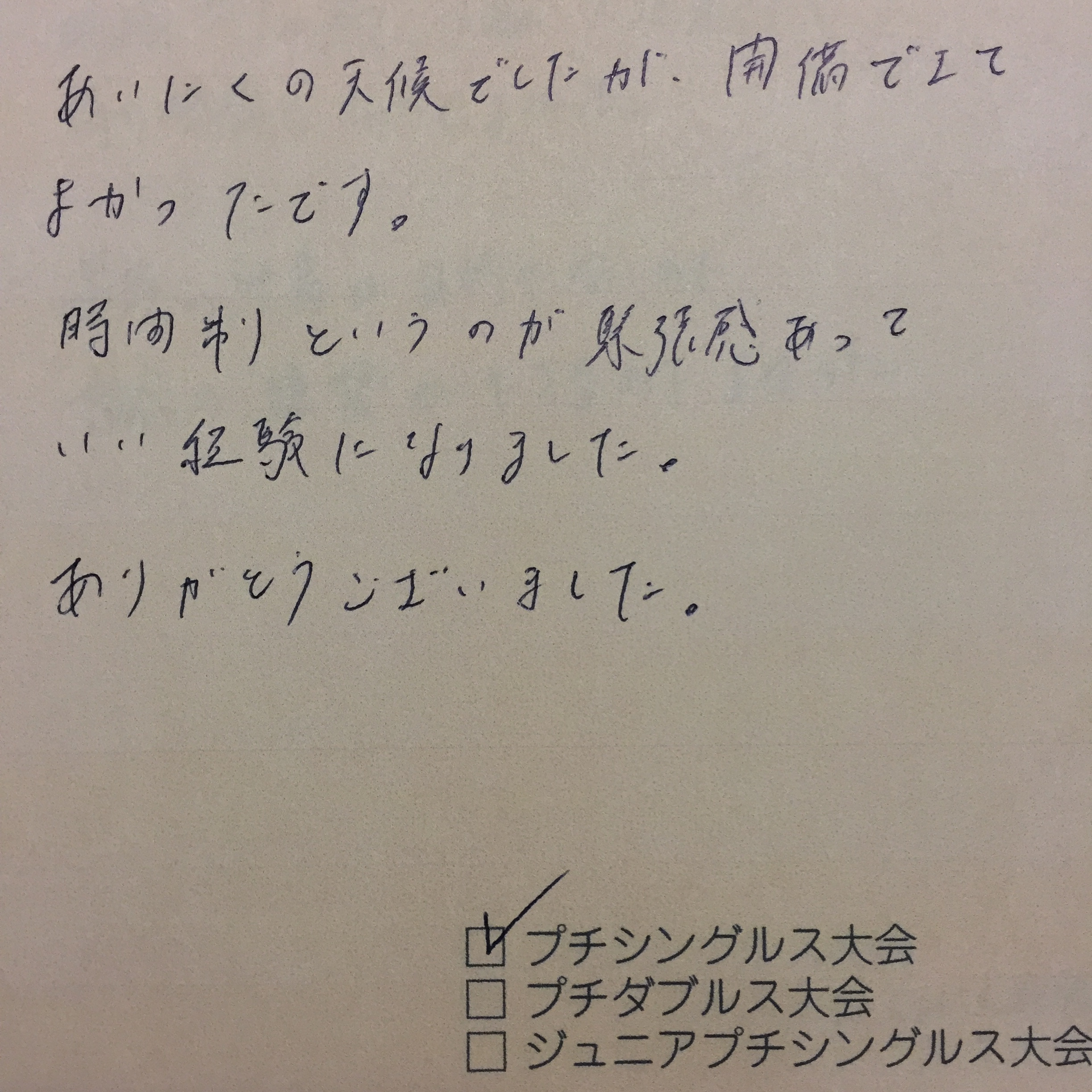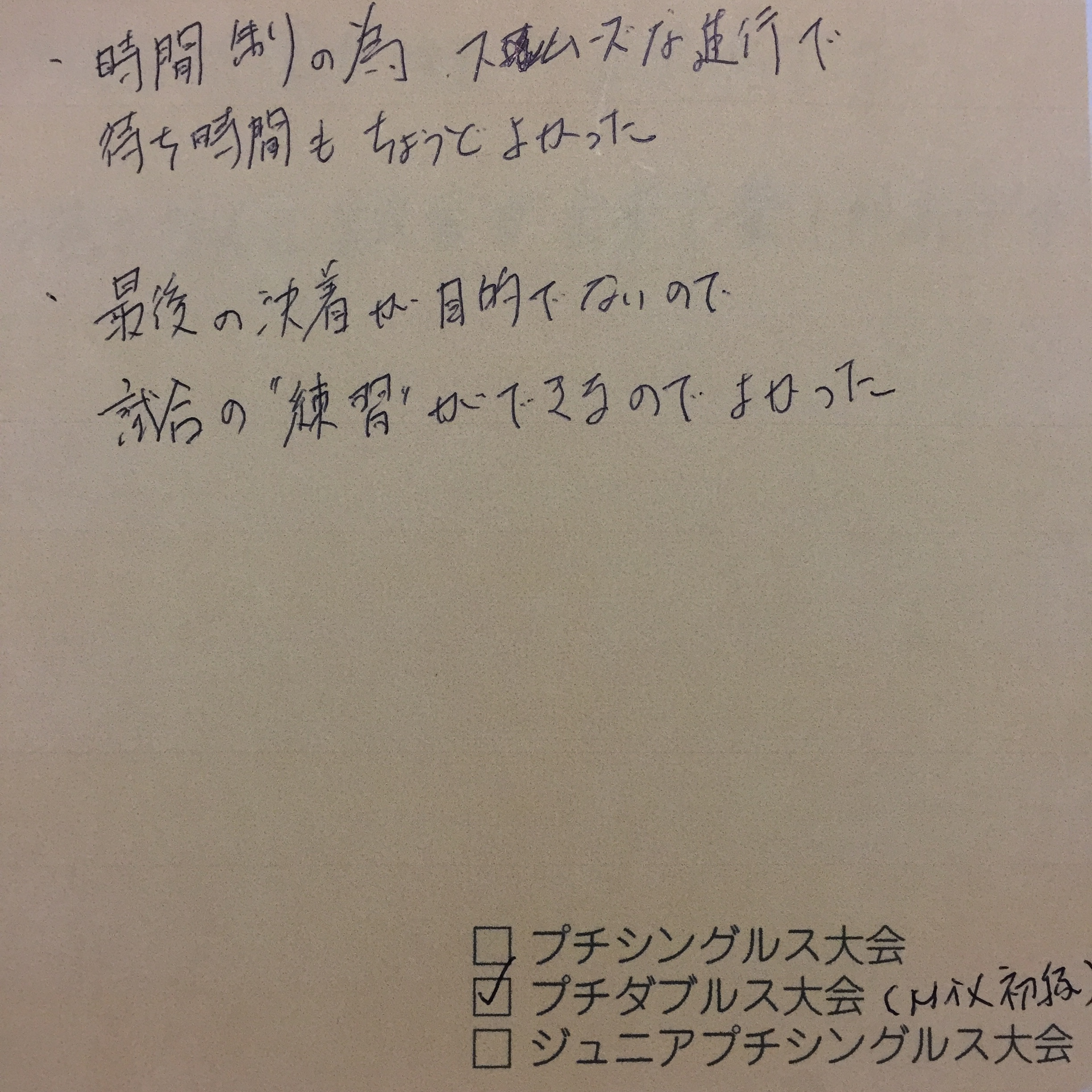 今回は、プチシングルス大会やプチダブルス大会に初めて参加してくださったみなさんの感想をアップさせていただきます!