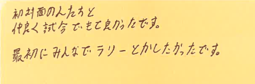 それと、「最初にラリーができれば・・・」と言うご要望ですが、多くの大会で大会前にラリーができるのであれば、それも試合経験のうちなので、やらせていただきますが、特に多くの市民大会などは、サーブ4本しかアップをさせてくれないところが多いため、それに準ずる意味で、サーブ4本のみのアップとさせていただいておりますので、ご了承いただけたらと思います。