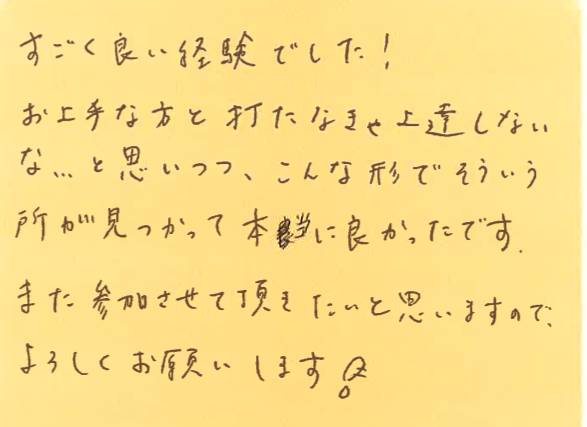 「時間制限があるので試合前は短いと思っていたが、やると丁度良い感じだったので満足しました」とのこと、ありがとうございます!