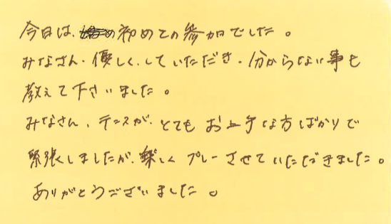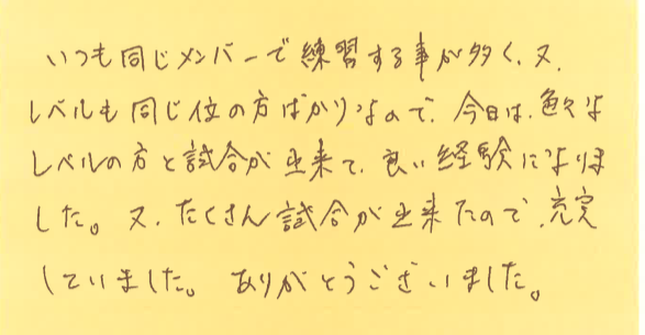 おっしゃる通り、いつもの環境だと、限られた人としかボールを打てないので、こういう場所で、色々なレベルの方と対戦することで、質の高い経験を絵詰めるんですよね!!