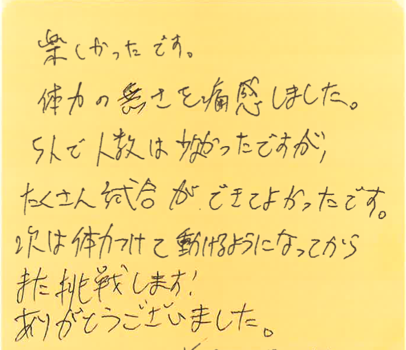 体力は・・・徐々に戻るはずですし、また来ていただくと、ペース配分も上手になっていくはずなので、ぜひまた気軽に挑戦しに来てくださいませ!!