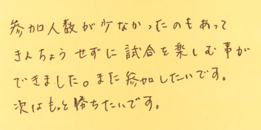 こじんまりした大会となりましたが、それはそれで緊張せずにできたと言うことでよかったです!