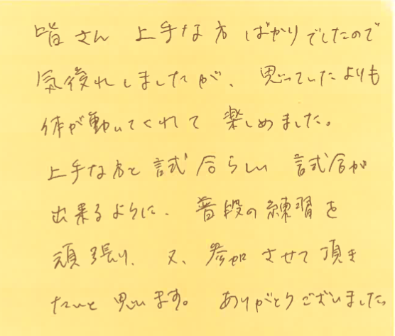 ぜひまた参加して、試合経験を楽しみながら積んで、どんどん強くなってくださいませ!