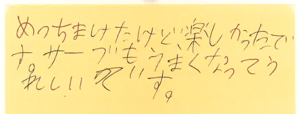 サーブは、試合に出ると、普段の練習よりもたくさん打つ機会があるので、そんな中で「上手くなった」と実感されたのでしたら、素晴らしいです!
