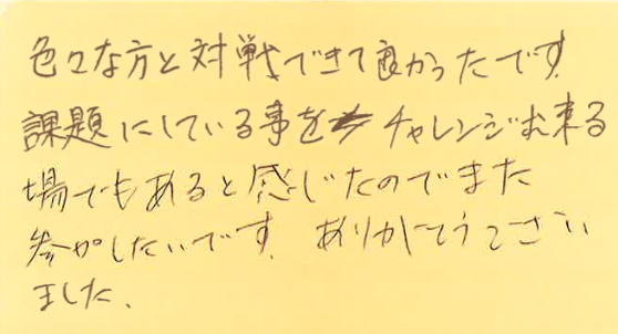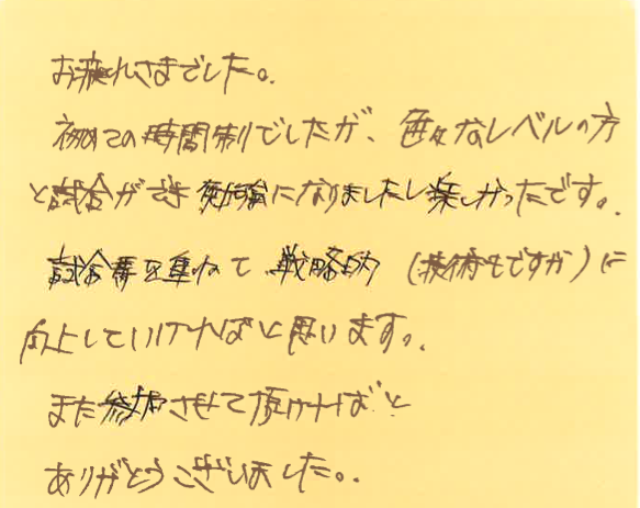 初めての時間制の試合を楽しんで頂け、さらに勉強にもなったとのこと、うれしいです!