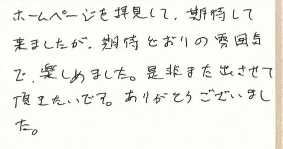 期待通りの雰囲気で楽しめたとのことで、大変うれしいです!