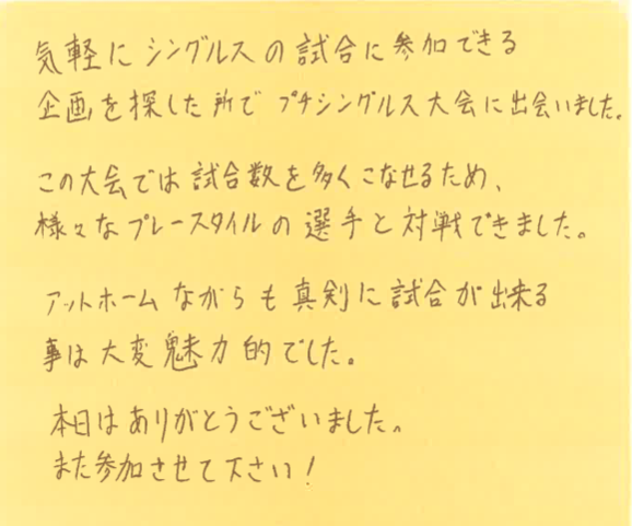 「気軽にシングルスの試合に参加できる企画」をお探しの中、こちらの大会を見つけてご参加いただき、大変うれしいです!