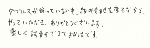 この日は、久々にダブルスを企画したのですが、参加者があまり集まりませんでしたので、変則的な対応をさせていただきました。