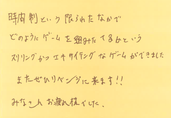 時間制の中でのゲームの組み立ては難しいですが、スリリングかつエキサイティングなゲームができたとのことで、うれしいです!