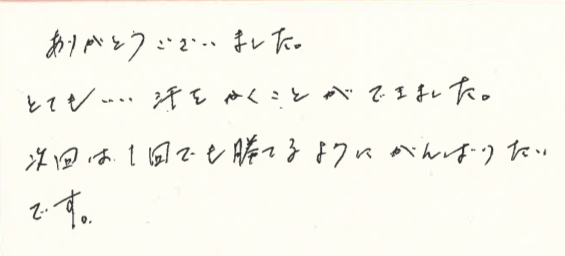 良かったです!今回の経験を活かして、次回は勝てるように祈っています!