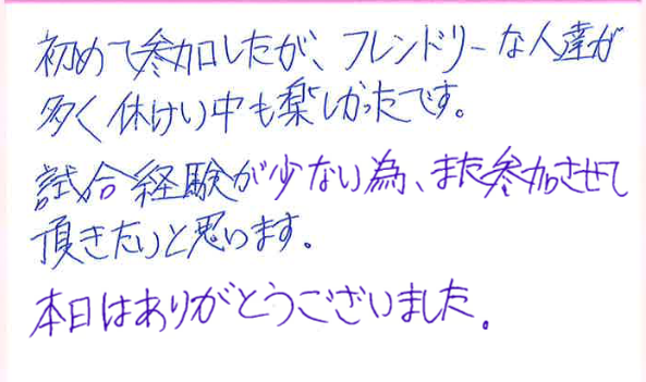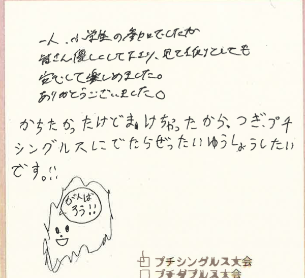 大人の中に混じって・・・というのは、あまり経験がないことだと思うのですが、意外にも皆さん優しく相手をしてくれたりするので、本気で向かってくるジュニアの選手とは全然違った意味で、非常に質の高い試合経験を積めることが多いんです。