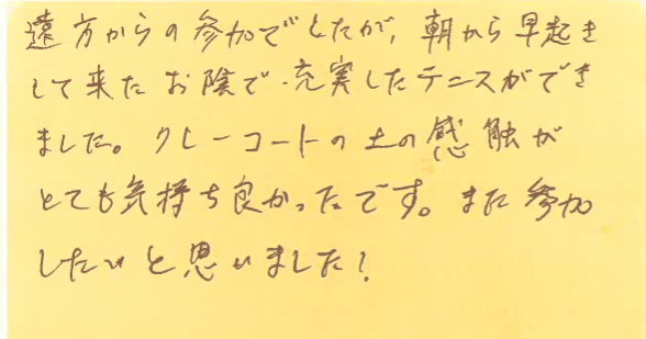 クレーコートの土の感触が気持ち良かったとのこと、良かったらまたご参加くださいませ!