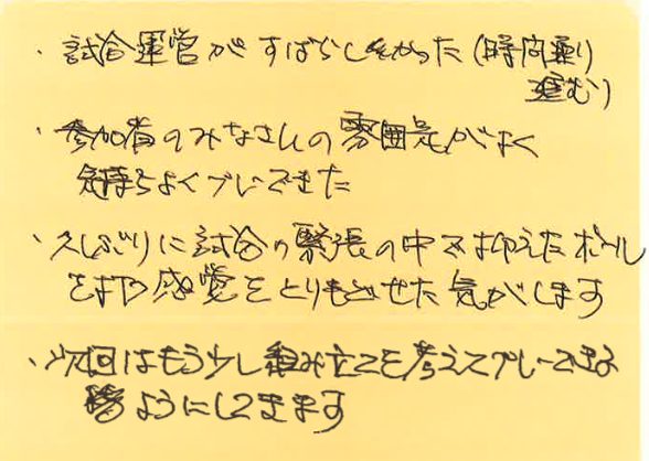 それと、「久しぶりに試合の緊張の中で・・・」とのことですが、そうなんですよね!試合の勘が鈍ってしまうと、本番で勝てないので、その辺りもお楽しみいただきつつ参加者の皆さんと気持ちよくプレーして頂けて、うれしいです!