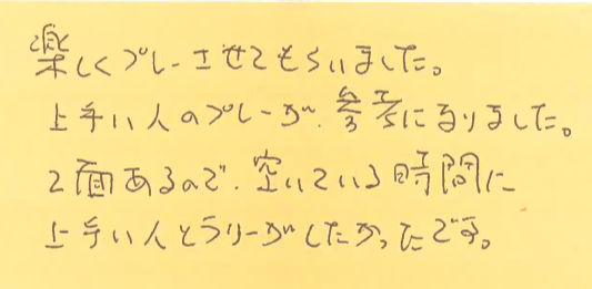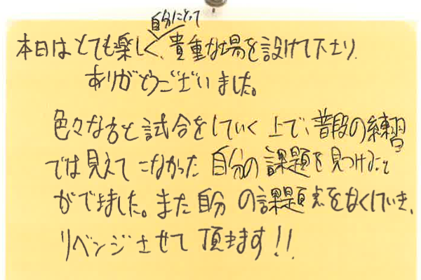 色々な方との対戦で、普段の練習では見えていなかった課題が見つかったとのことで、ぜひリベンジにご参加くださいませ!