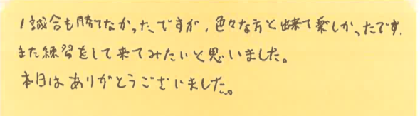 1試合も勝てなかった・・・とのことですが、試合経験を積むことこそが大事で、徐々に勝利を手に入れるためのコツや経験が蓄積されていきますので、リベンジがてら、ぜひまた気軽にお越しくださいませ!!