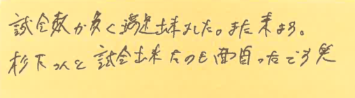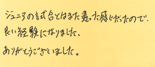 ジュニアの試合とはまた違った感じを味わっていただき、良い経験になったとのこと・・・そうなんですよね!いろいろな年代の方と対戦することで得られること、すごく多いんです!