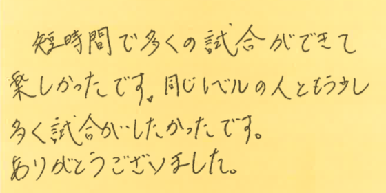 「同じレベルの人ともう少し多く試合をしたかった」とのことですが、毎回、いろいろなレベルの方が参加されるので、日によってはどうしても、レベルのばらつきが出てしまいます。