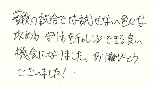 「普段の試合では試せない色々な攻め方、守り方をチャレンジできる良い機会になりました」とのことで、とてもうれしいです!