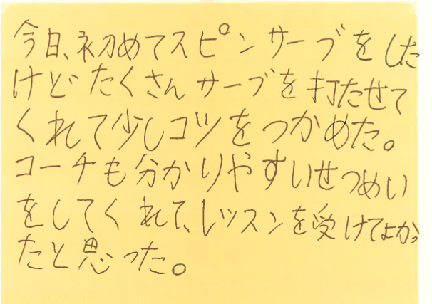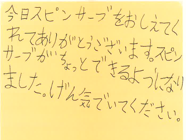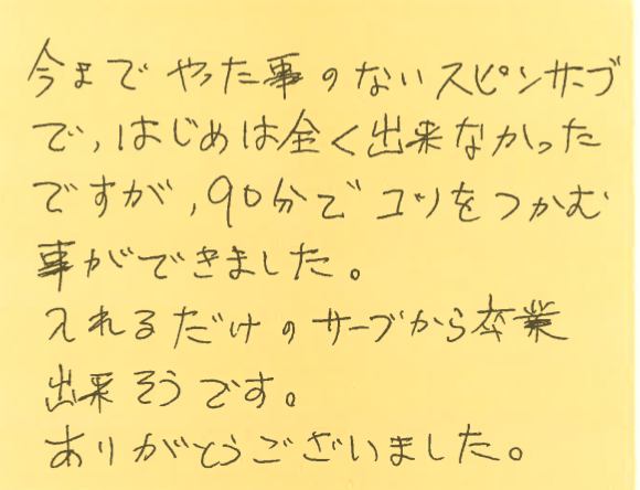 スピンサーブのコツを90分でつかむことができたのは、すごいですね!!