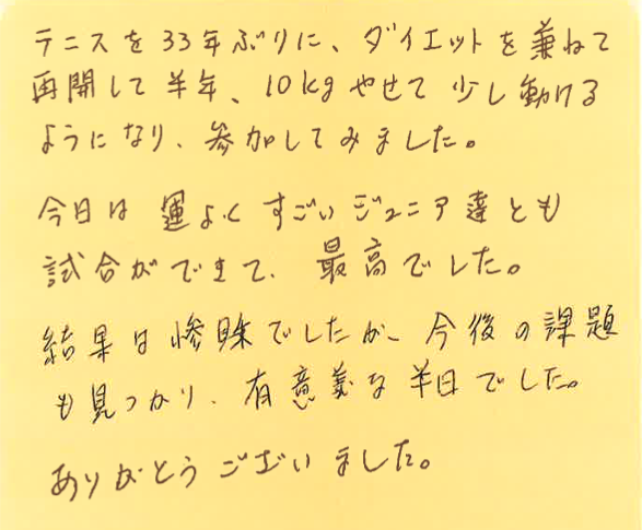 テニスを33年ぶりに再開してハントして10kg痩せられたのは、すごいですね!!