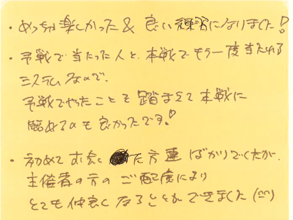 予戦でやったことを踏まえて本戦に臨め、さらに、初めてお会いした方達と仲良くなれたとのことで、