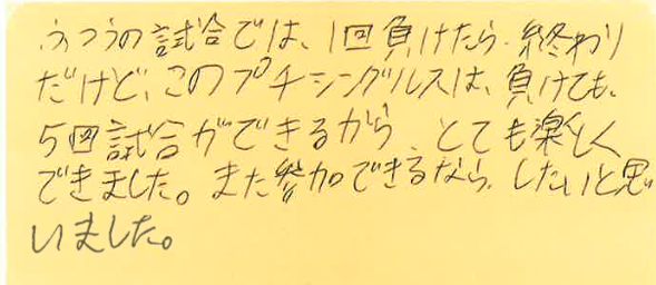 負けても5回できる、プチシングルス大会の強みを最大限に楽しんで頂けて嬉しいです!