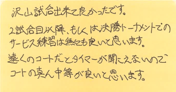 サービス練習については、今までにも同じようなご意見を頂戴しておりますが、試合に勝つためにとても大切なプロセスだと思っておりますので、やることにしております。